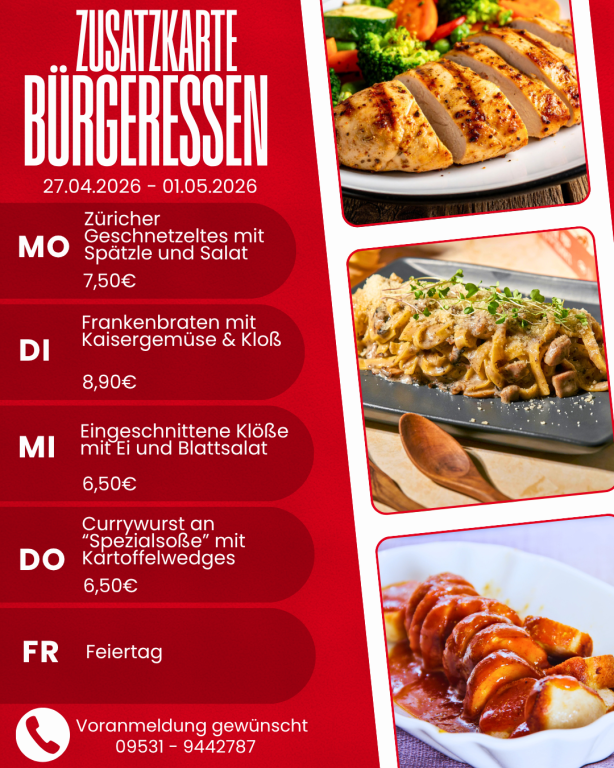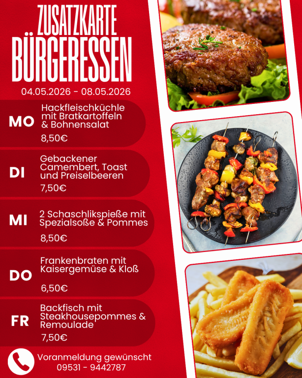 Melden Sie sich zum Bürgeressen bitte an! Täglich bis spätestens 10:00 Uhr unter der Telefonnummer 09531-9442789 kurz anmelden. Wir decken dann schon Ihren Platz ansprechend ein.