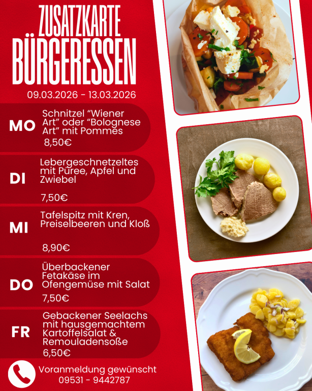 Melden Sie sich zum Bürgeressen bitte an! Täglich bis spätestens 10:00 Uhr unter der Telefonnummer 09531-9442789 kurz anmelden. Wir decken dann schon Ihren Platz ansprechend ein.
