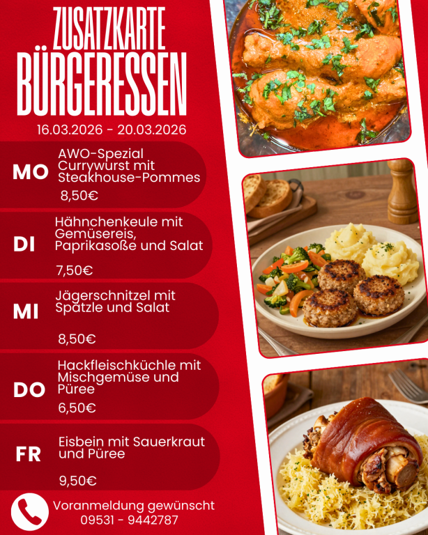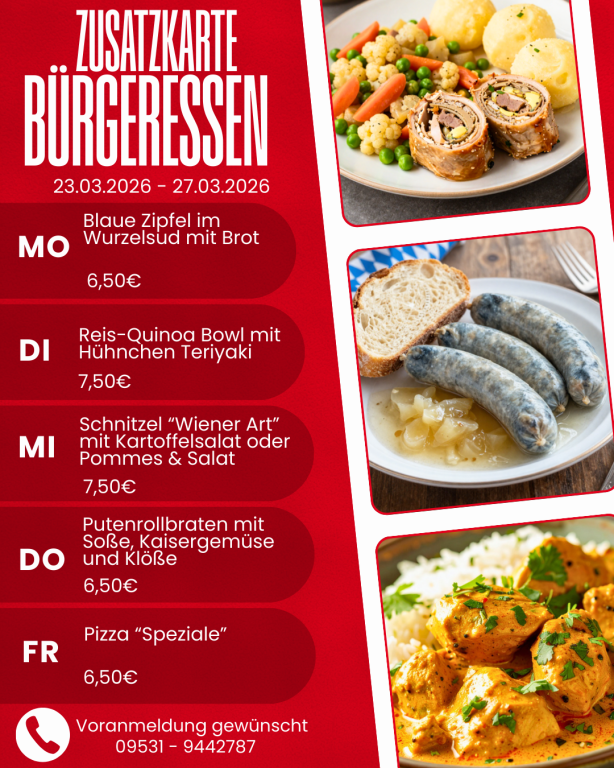 Melden Sie sich zum Bürgeressen bitte an! Täglich bis spätestens 10:00 Uhr unter der Telefonnummer 09531-9442789 kurz anmelden. Wir decken dann schon Ihren Platz ansprechend ein.